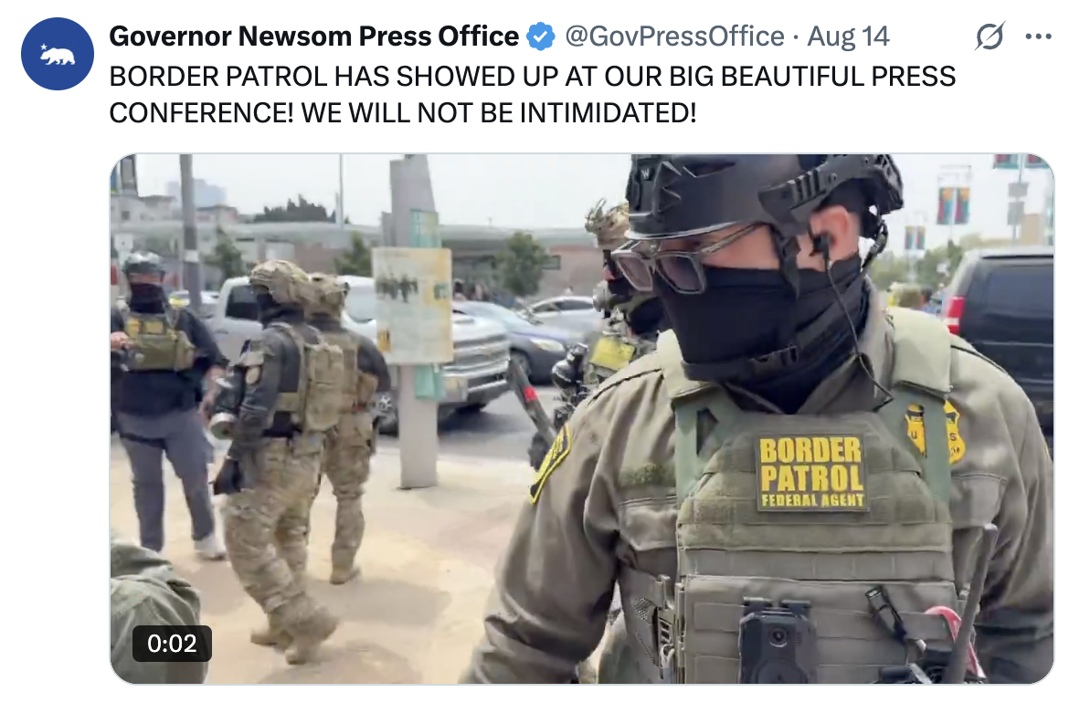 The Office of Governor Newsom is submitting the formal request for all documents, communications, and records regarding the Trump administration’s decision to send dozens of federal agents just outside of a widely publicized event on August 14 at the Democracy Center in Los Angeles, where a group of people, including California’s elected officials such as the Governor and congressional and California legislative leaders, gathered to announce an effort challenging to the administration’s efforts to rig the upcoming midterm elections. The letter also requested information about the administration’s communications with Fox News to embed a reporter and camera crew with the group of ICE agents.