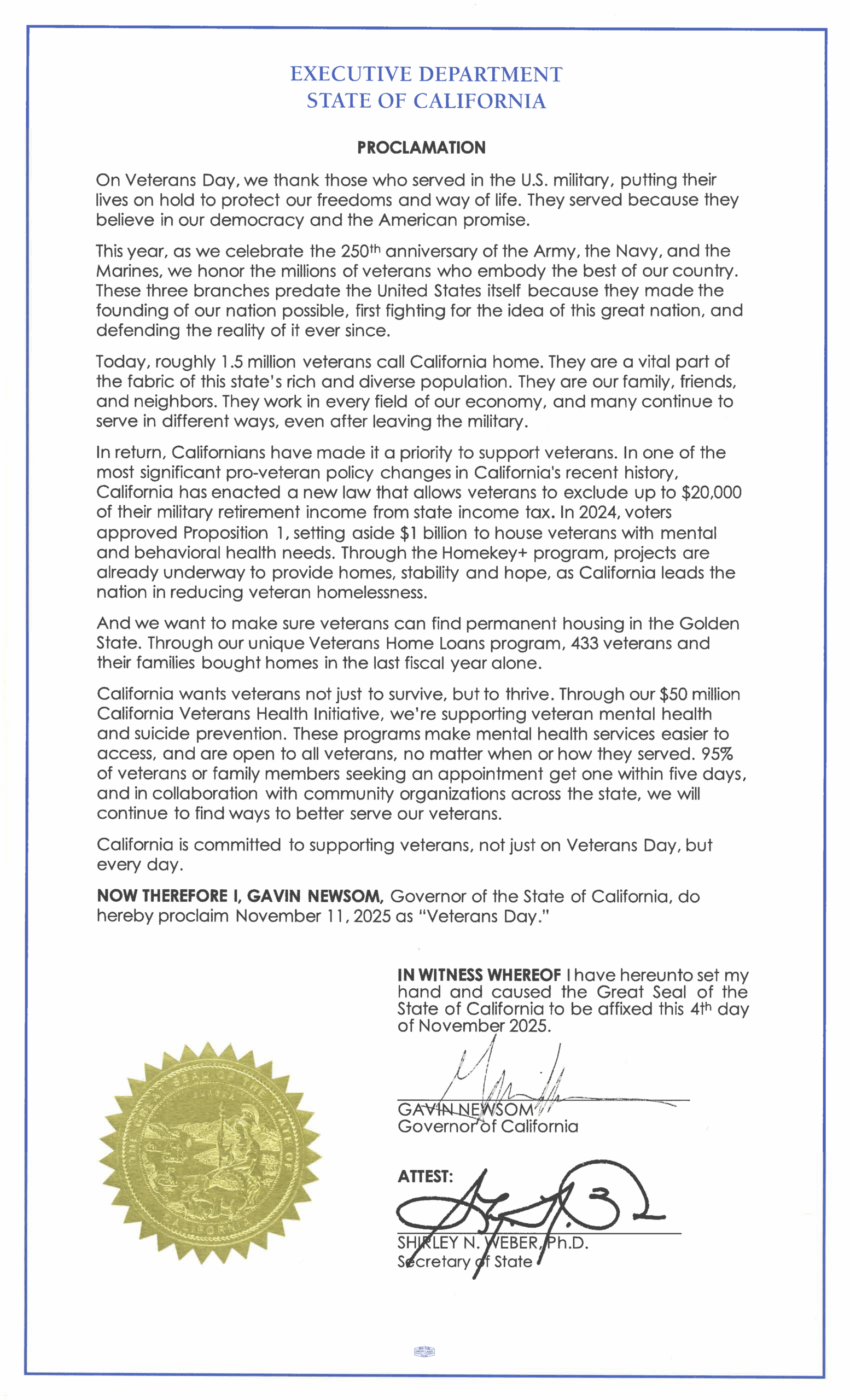 NOW THEREFORE I, GAVIN NEWSOM, Governor of the State of California, do hereby proclaim November 11, 2025 as “Veterans Day.”