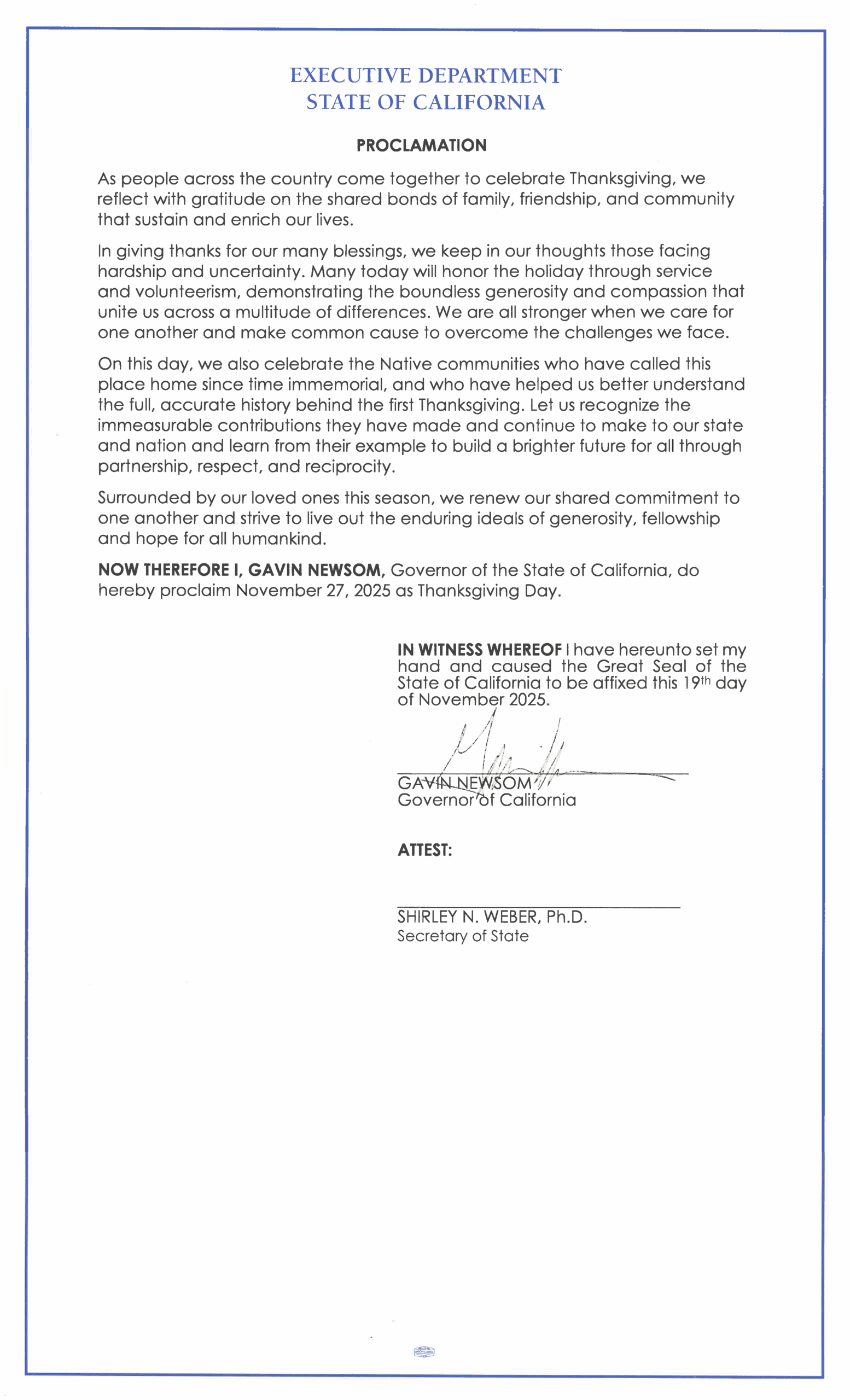 NOW THEREFORE I, GAVIN NEWSOM, Governor of the State of California, do hereby proclaim November 27, 2025 as Thanksgiving Day.