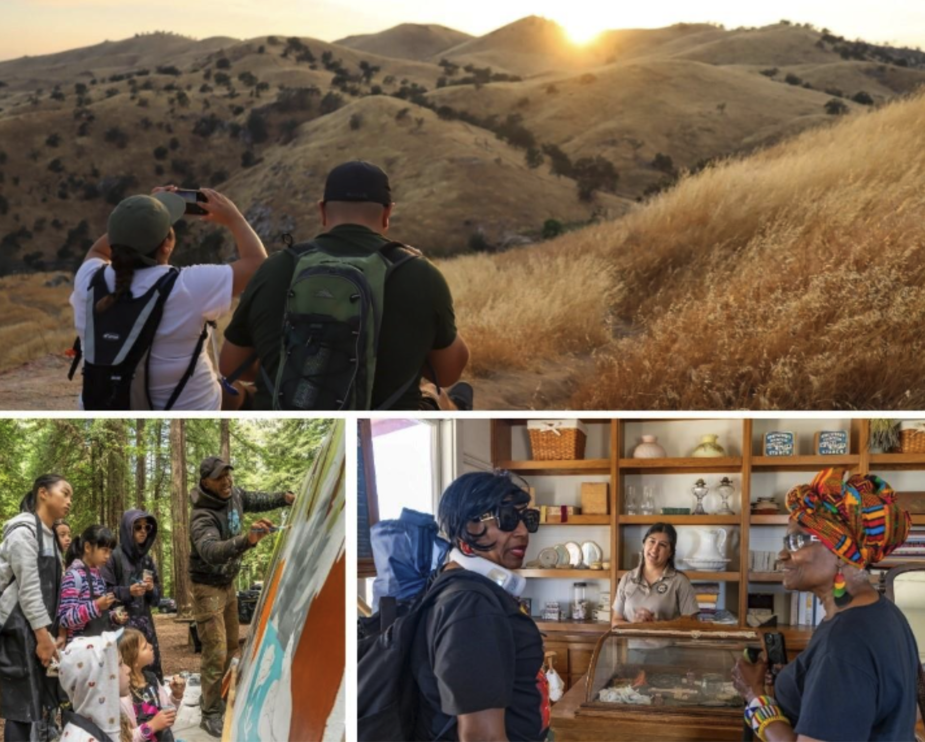 Top photo: Hikers enjoy a sunset at Millerton Lake State Recreation Area. Bottom right: Visitors walk through Colonel Allensworth State Historic Park during a Juneteenth event. Bottom left: Children enjoy the redwoods and painting during California State Parks Week at Samuel P. Taylor State Park. Photos from California State Parks