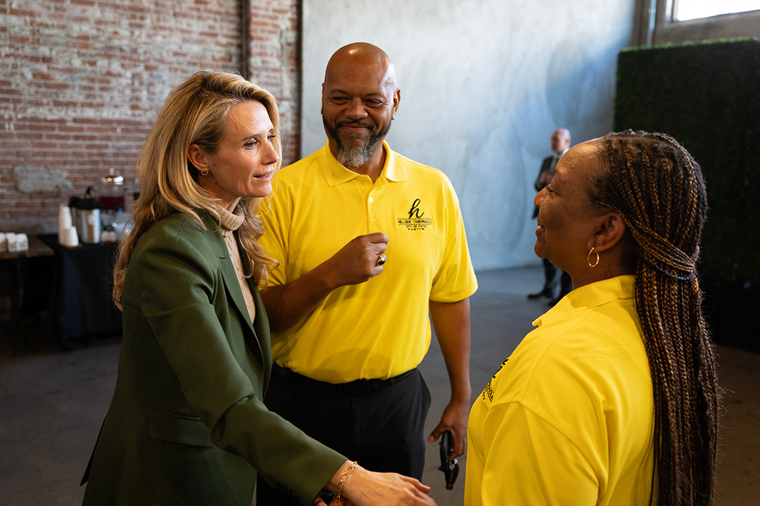 The Governor and First Partners later visited a temporary memorial exhibition curated by the Department of Angels in Los Angeles to meet with survivors of the Palisades and Eaton Fires and hear directly about their recovery journeys and ongoing needs. The visit began with a tour of the immersive memorial space honoring lives, homes, and communities impacted by the fires with visuals, sounds, art, and recorded testimony from survivors.