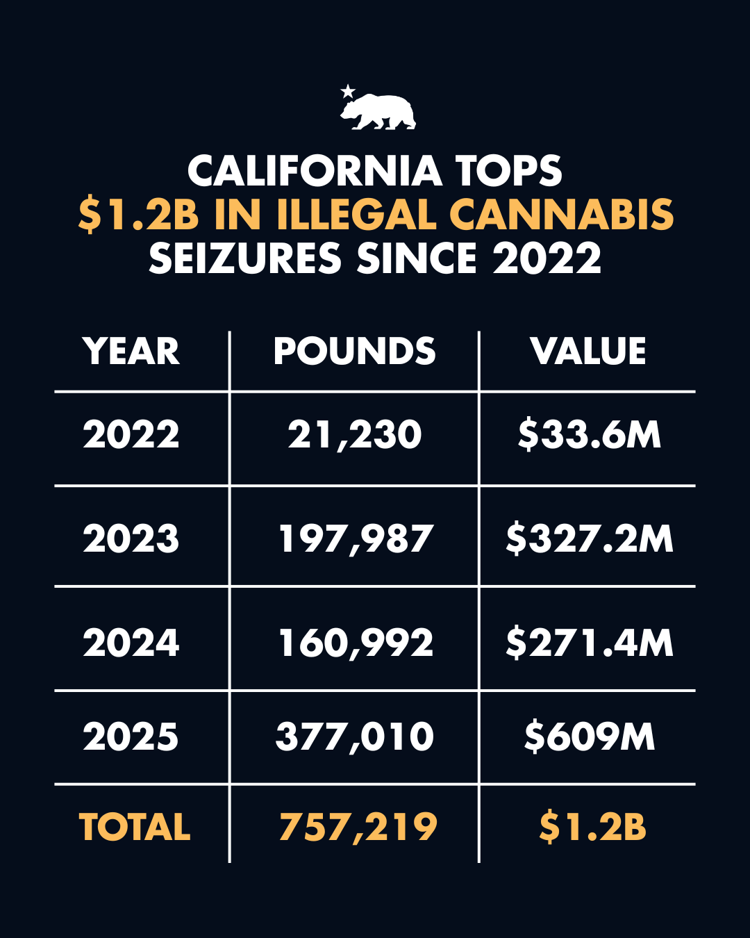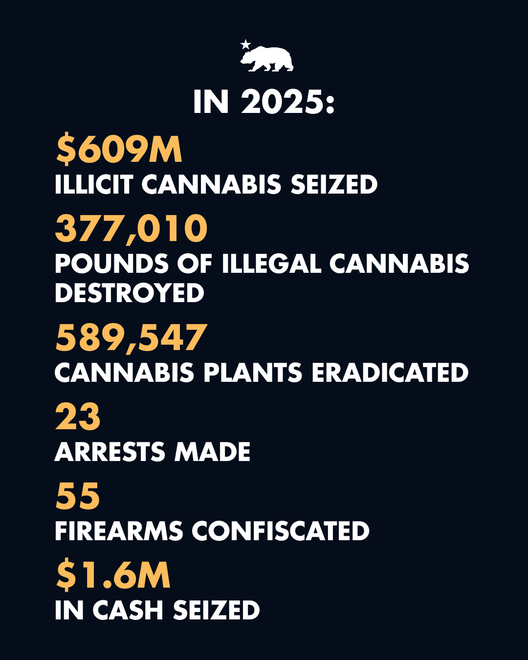 In 2025, law enforcement officials conducted 48 operations across 23 counties, executing more than 250 search warrants with more than 60 partner agencies. These efforts led to the seizure and destruction of 188 tons of illicit cannabis worth over $600 million.