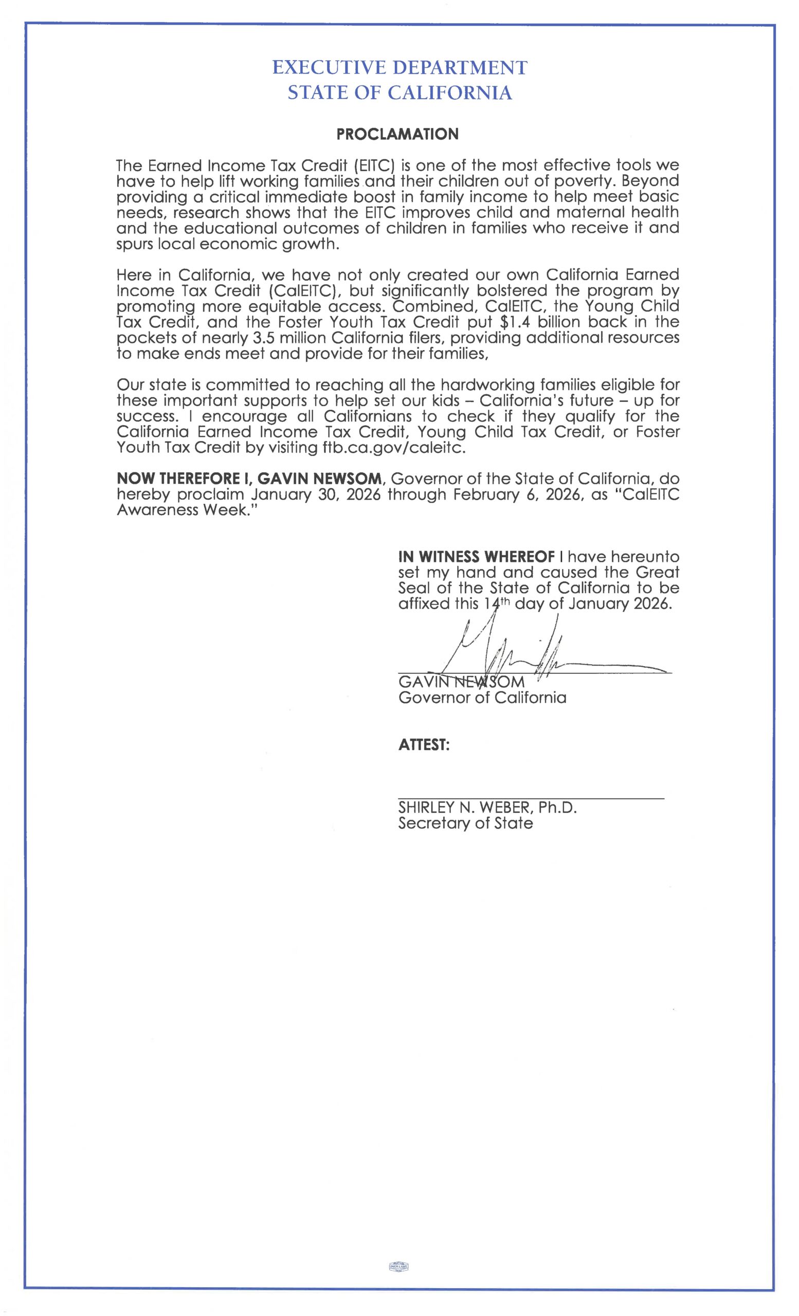 NOW THEREFORE I, GAVIN NEWSOM, Governor of the State of California, do hereby proclaim January 30, 2026 through February 6, 2026, as “CalEITC Awareness Week.”