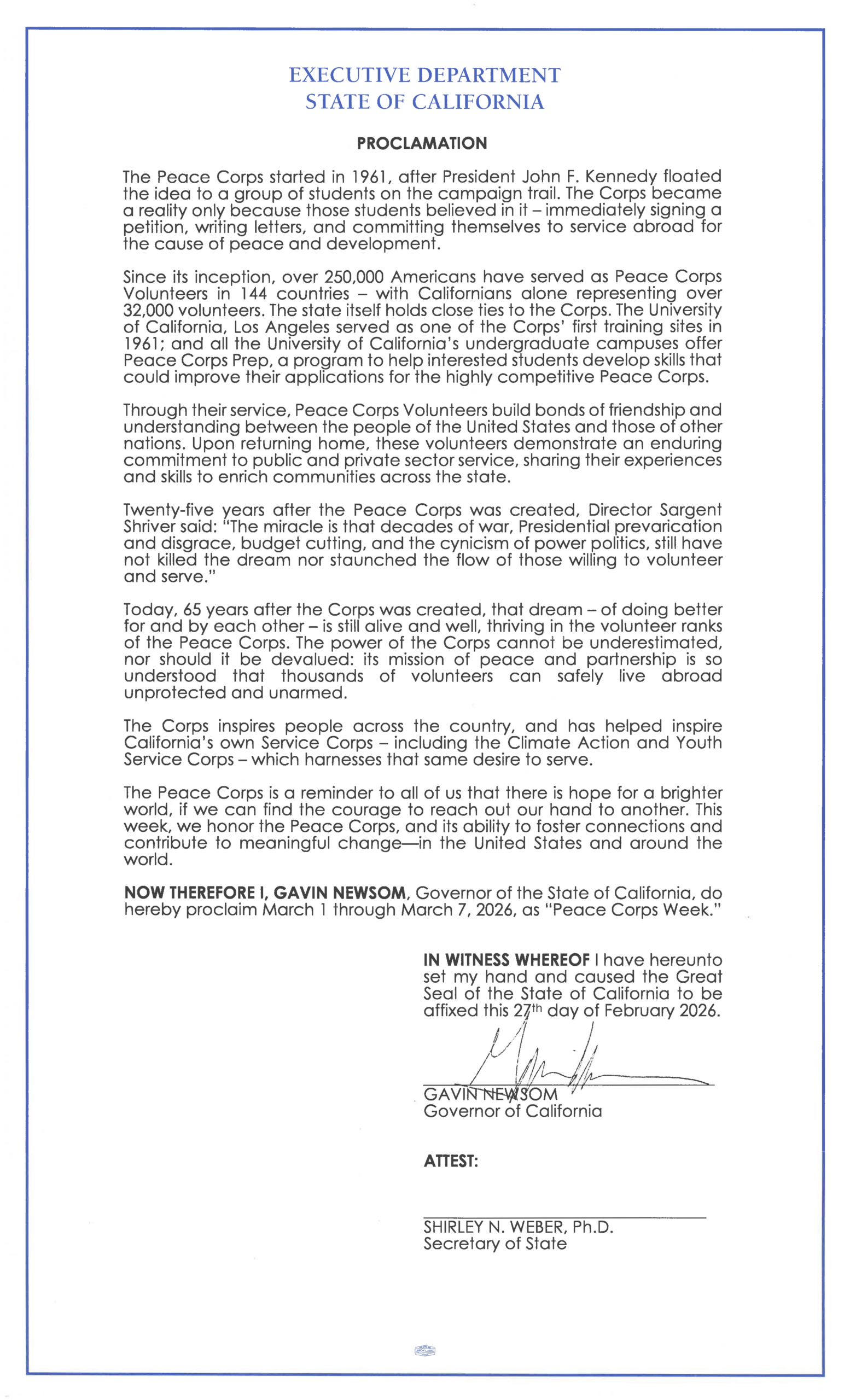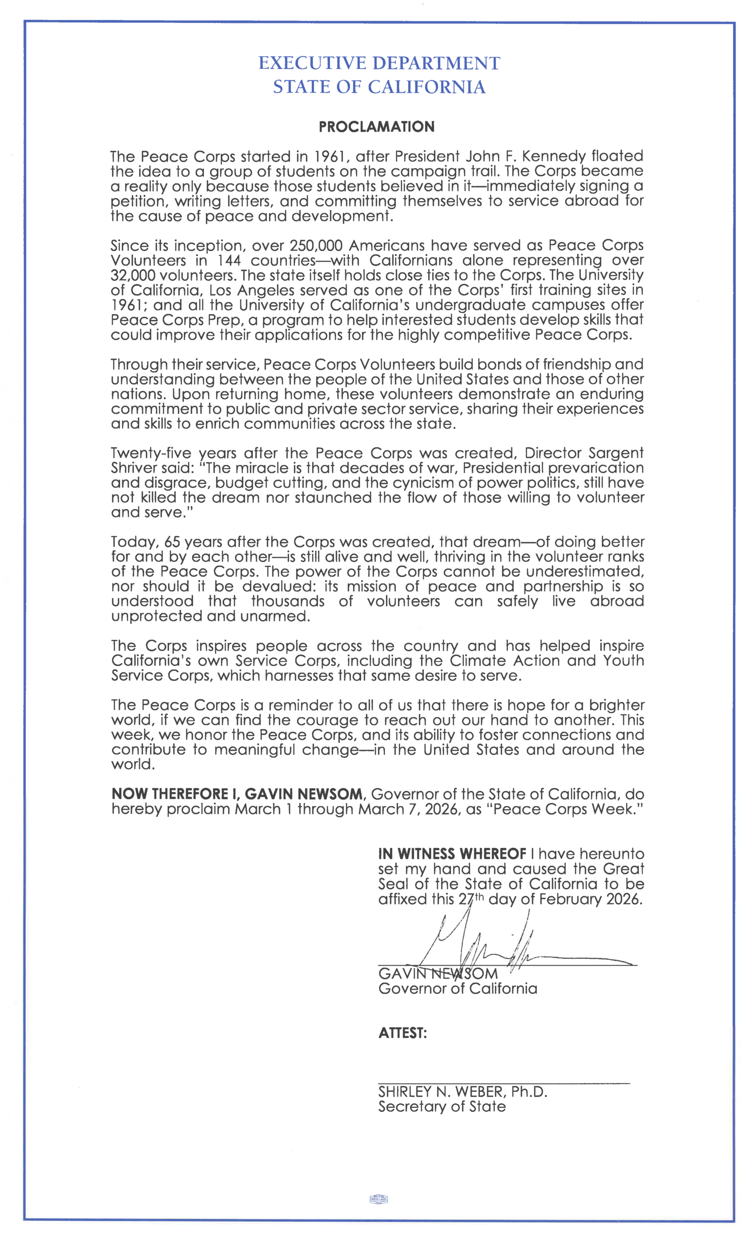NOW THEREFORE I, GAVIN NEWSOM, Governor of the State of California, do hereby proclaim March 1 through March 7, 2026, as “Peace Corps Week.”