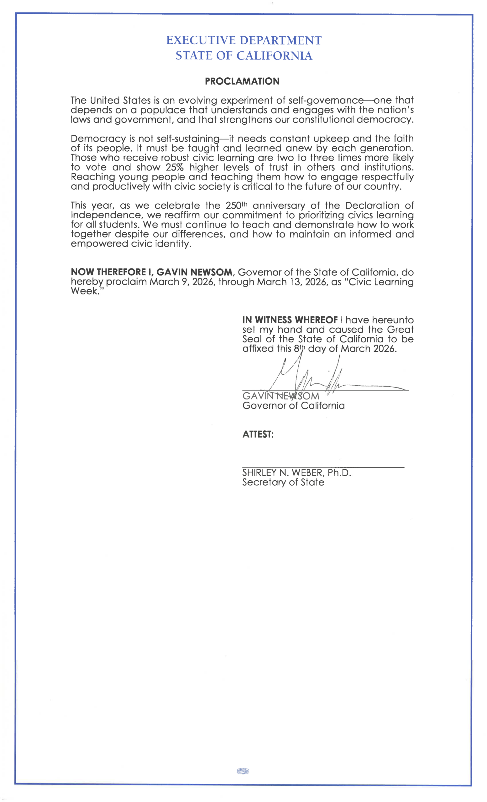 NOW THEREFORE I, GAVIN NEWSOM, Governor of the State of California, do hereby proclaim March 9, 2026, through March 13, 2026, as “Civic Learning Week.”