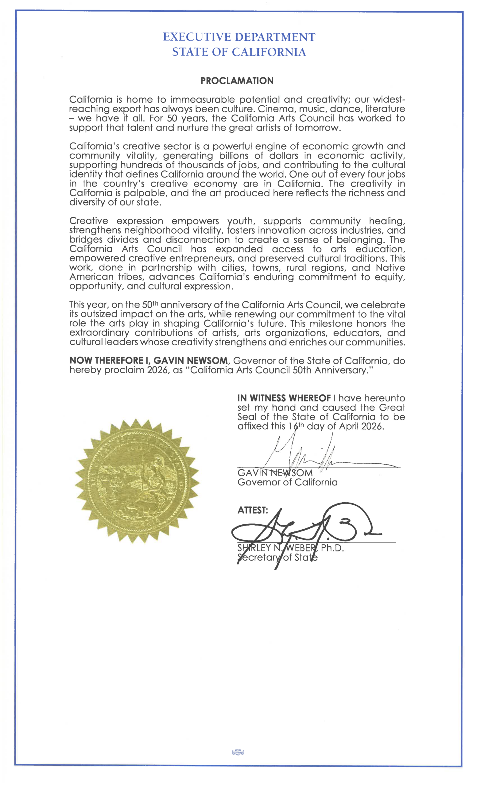 NOW THEREFORE I, GAVIN NEWSOM, Governor of the State of California, do hereby proclaim 2026, as “California Arts Council 50th Anniversary.”