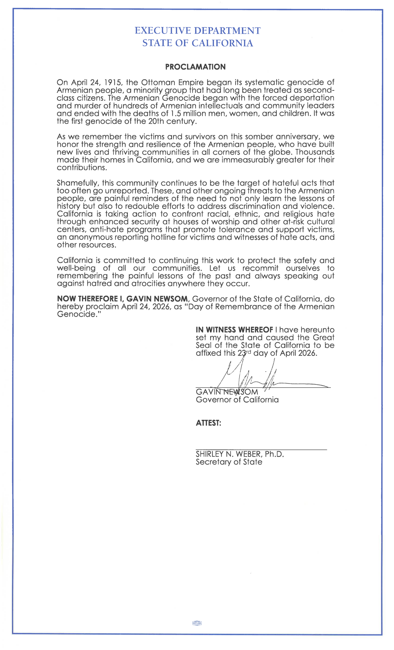 NOW THEREFORE I, GAVIN NEWSOM, Governor of the State of California, do hereby proclaim April 24, 2026, as “Day of Remembrance of the Armenian Genocide.”