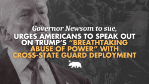 News Governor Newsom to sue, urges Americans to speak out on Trump’s “breathtaking abuse of power” with cross-state Guard deployment SACRAMENTO — Governor Gavin Newsom today issued the following statement in response to the Trump Administration deploying 300...					Read MoreRead more about Governor Newsom to sue, urges Americans to speak out on Trump’s “breathtaking abuse of power” with cross-state Guard deployment